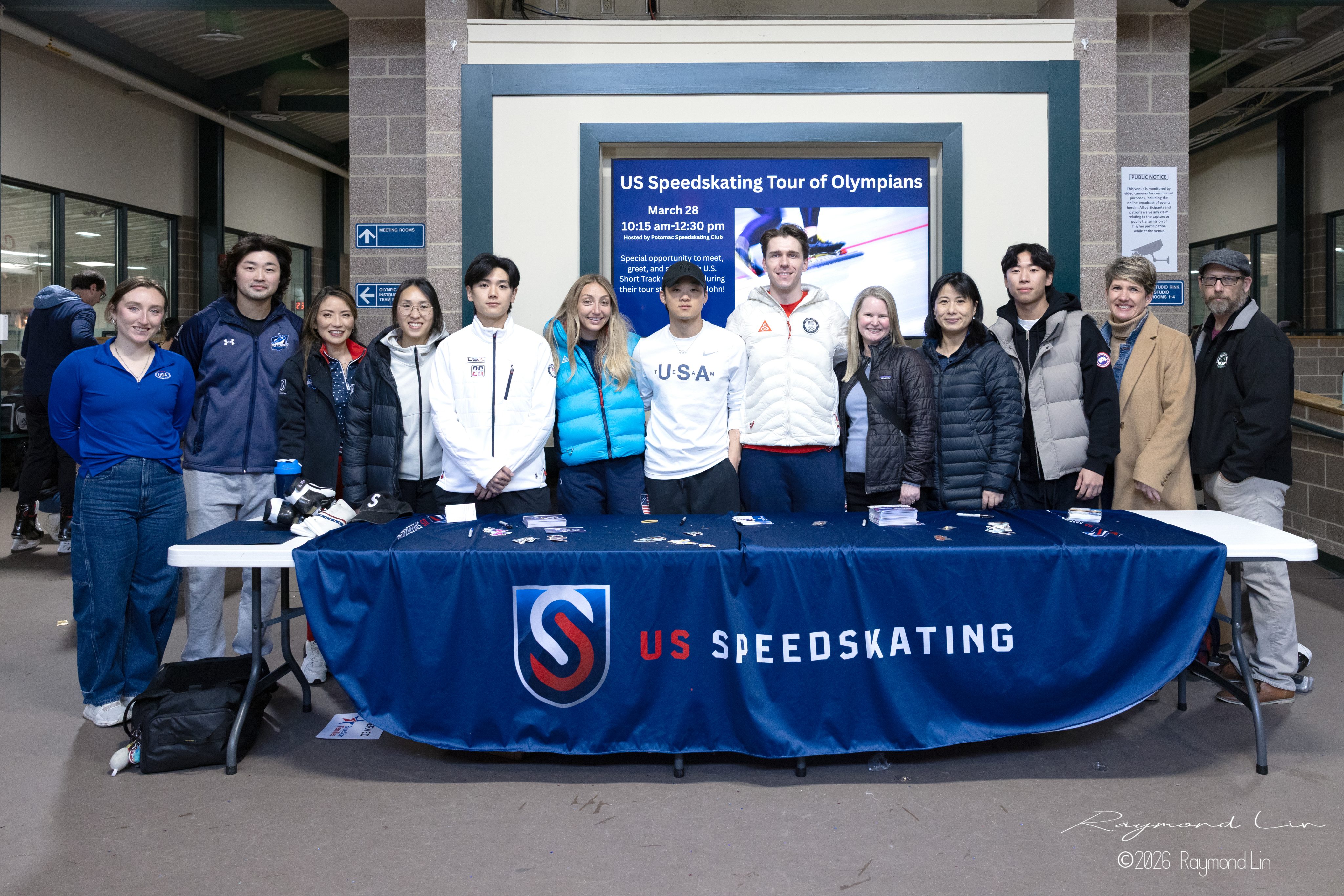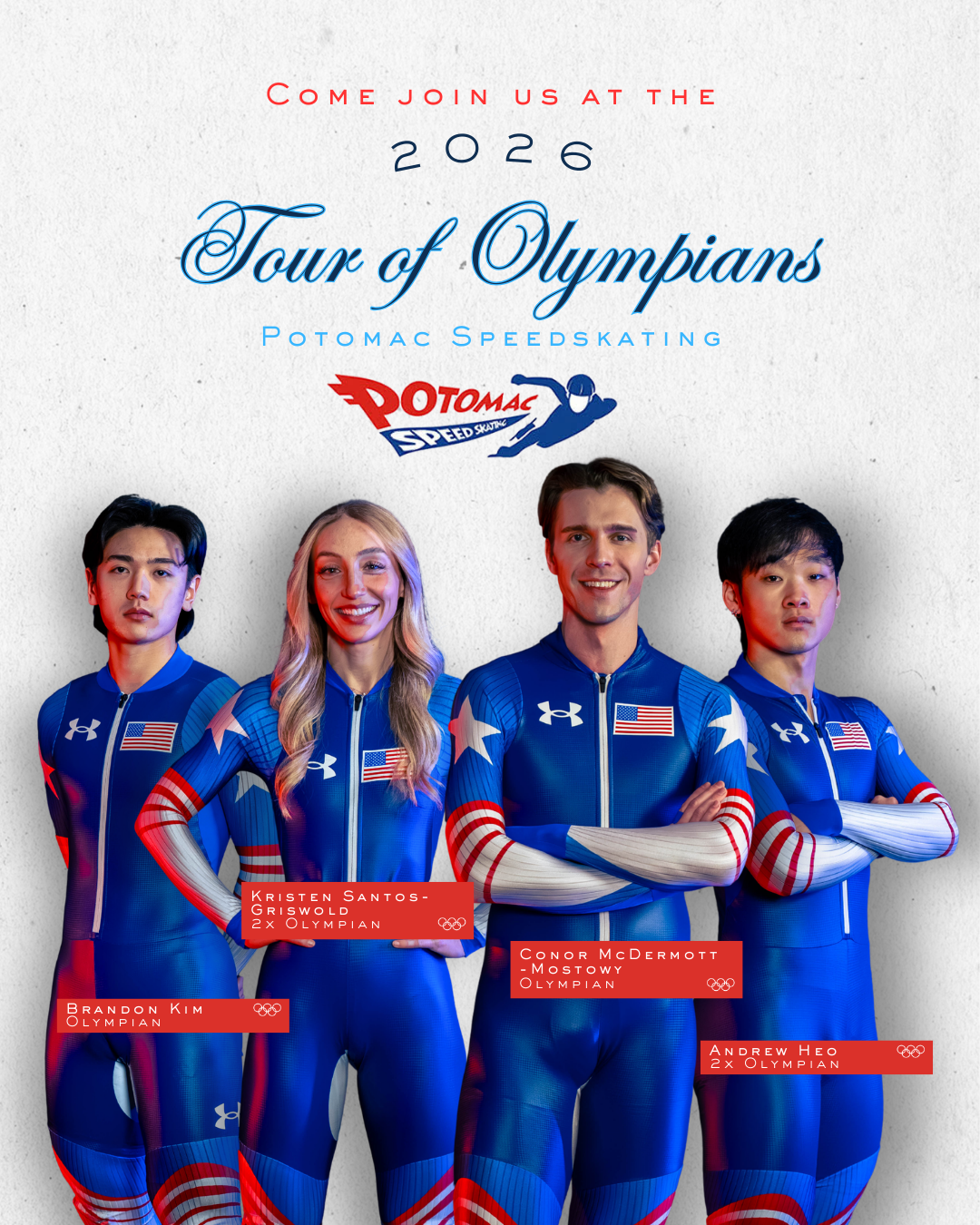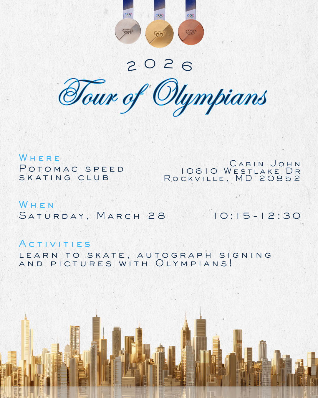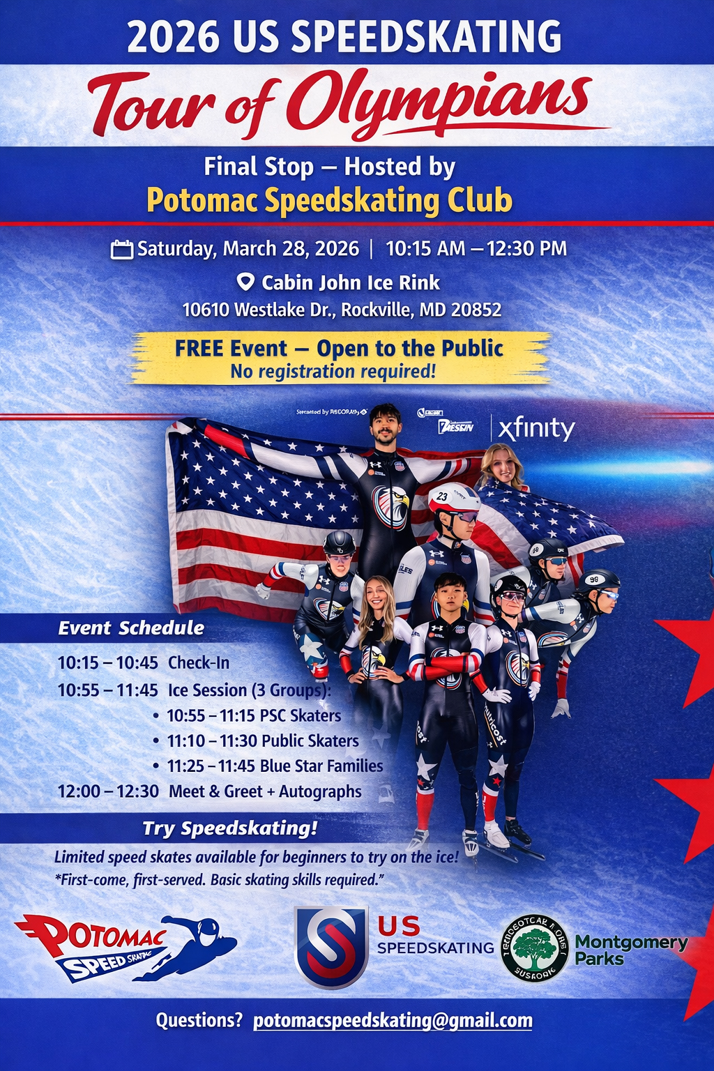 Potomac Speedskating Club (PSC) is thrilled to be the final stop of the 2026 US Speedskating Tour of Olympians! The event is scheduled for Saturday, March 28, 10:15 AM – 12:30 PM at Cabin John Ice Rink. The event is free and open to public; no registration is needed. It will feature both on-ice and off-ice activities.